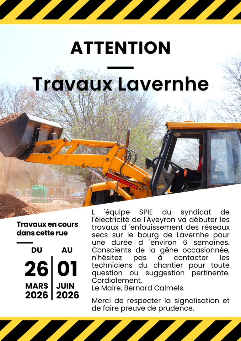 L ‘équipe SPIE du syndicat de l’électricité de l’Aveyron va débuter les travaux d ‘enfouissement des réseaux secs sur le bourg de Lavernhe pour une durée d ‘environ 6 semaines. Conscients de la gêne occasionnée, n’hésitez pas à contacter les techniciens du chantier pour toute question ou suggestion pertinente. Cordialement, Le Maire, Bernard Calmels.